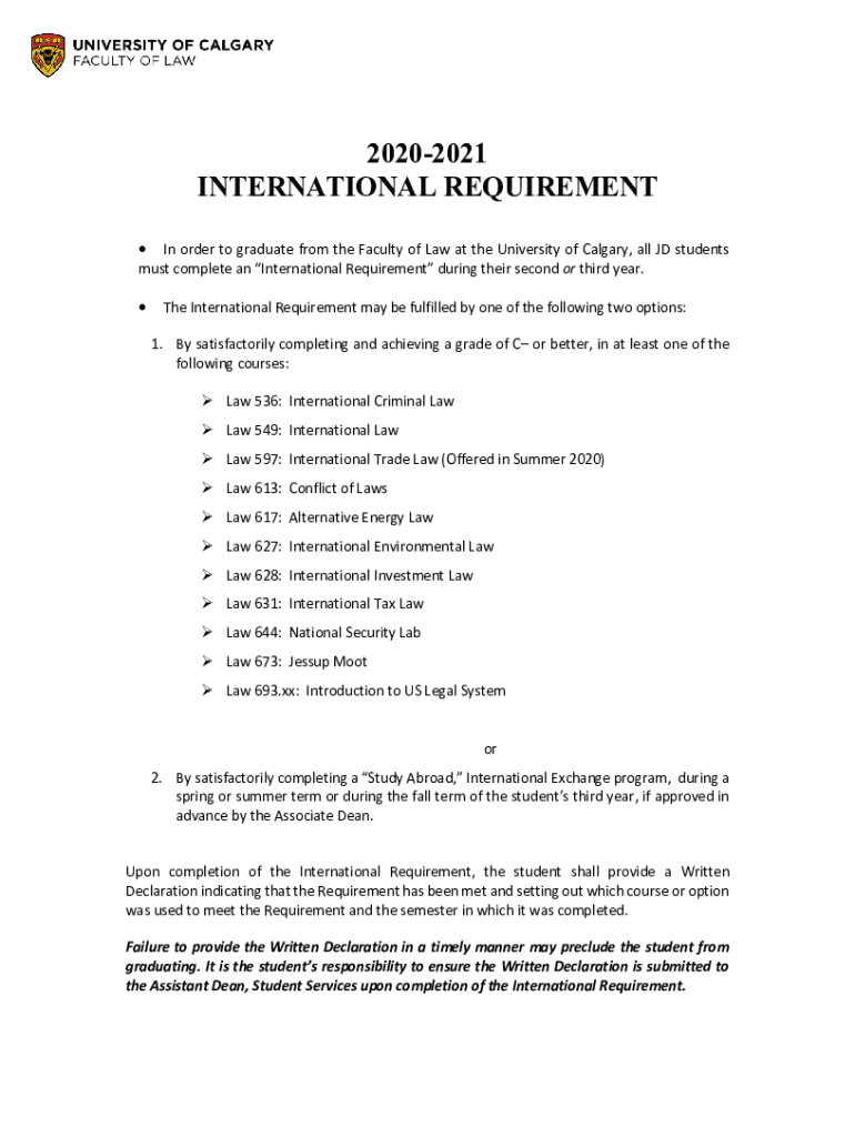 20202021 INTERNATIONAL Requirements In order to graduate from the Faculty of Law at the University of Calgary, all JD students must complete an International Requirement during their second or third