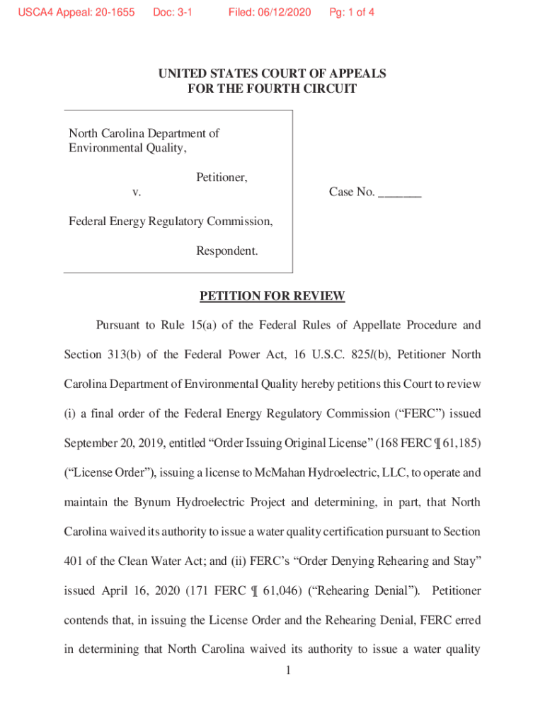 USCA4 Appeal: 201655Doc: 31Filed: 06/12/2020Pg: 1 of 4UNITED STATES COURT OF APPEALS FOR THE FOURTH CIRCUIT North Carolina Department of Environmental Quality, Petitioner, Case No. v. Federal Energy