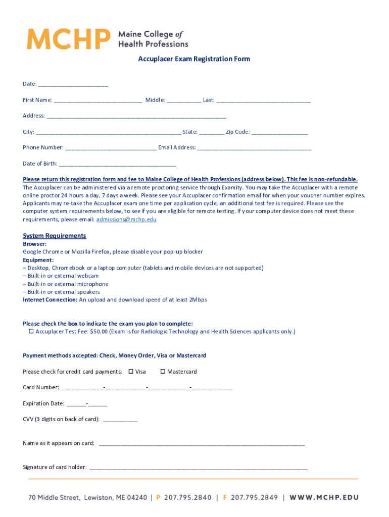 Accuplacer Exam Registration Form Date: First Name: Middle: Last: Address: City: State: Zip Code: Phone Number: Email Address: Date of Birth: Please return this registration form and fee to Maine