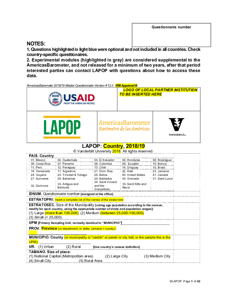 Questionnaire number NOTES: 1. Questions highlighted in light blue were optional and not included in all countries. Check country specific questionnaires. 2. Experimental modules (highlighted in gray)
