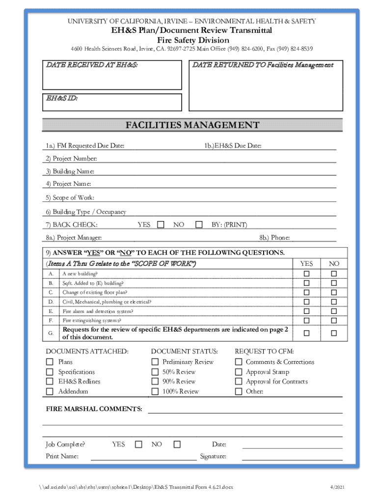 UNIVERSITY OF CALIFORNIA, IRVINE ENVIRONMENTAL HEALTH & SAFETIES Plan/Document Review Transmittal Fire Safety Division4600 Health Sciences Road, Irvine, CA. 926972725 Main Office (949) 8246200, Fax