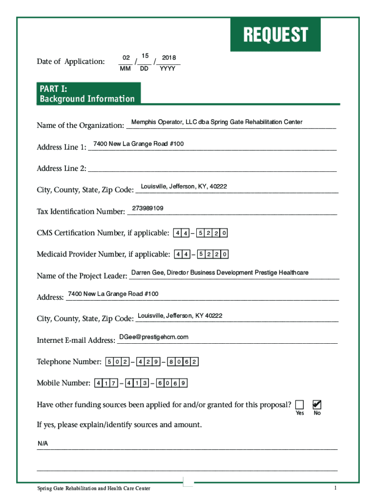 REQUEST Date of Application:02152018MMDDYYYY / / 1 “35* #BDLHSPVOE×OGPSNBUJPO Memphis Operator, LLC DBA Spring Gate Rehabilitation Center Name of the Organization: 7400 New La Grange Road #100
