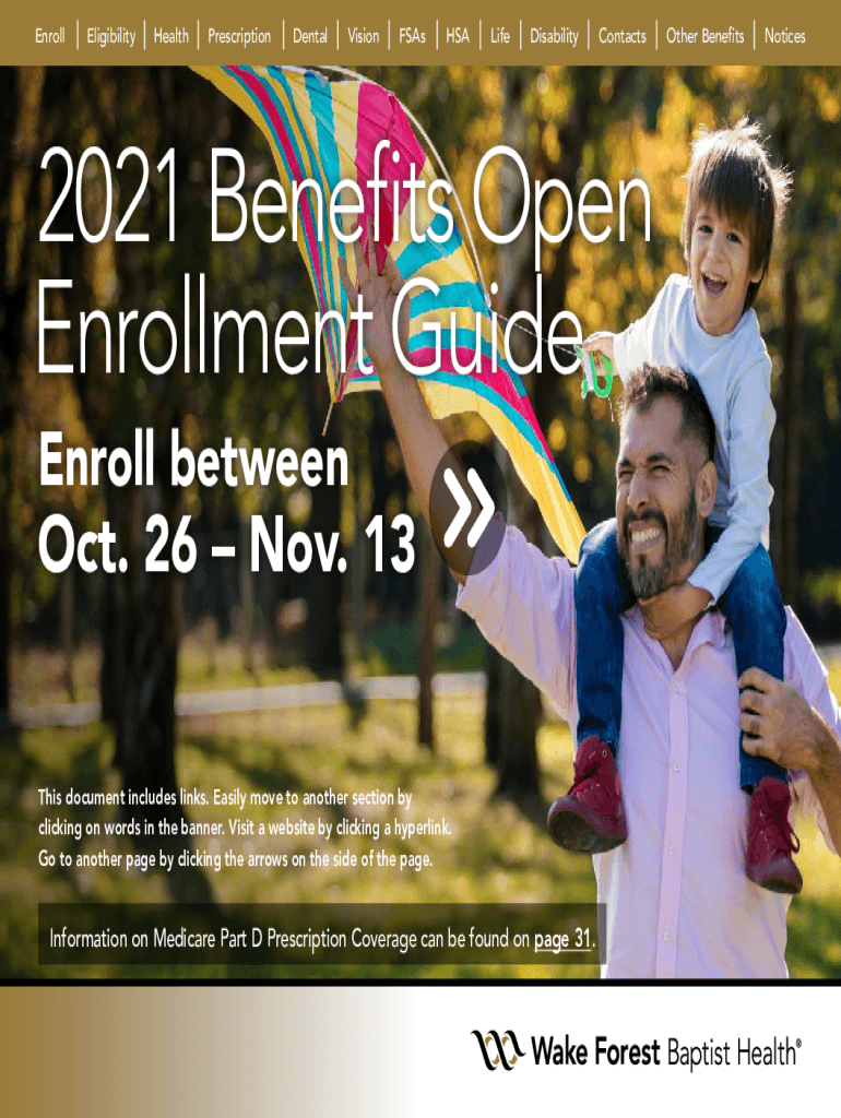 EnrollEligibilityHealthPrescriptionDentalVisionFSAsHSALifeDisabilityContacts2021 Benefits Open Enrollment Guide Enroll between Oct. 26 Nov. 13 This document includes links. Easily move to another
