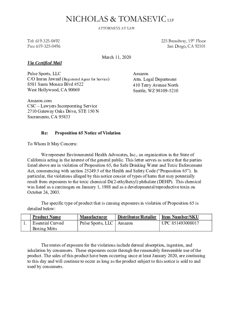 NICHOLAS & TOMASEVIC LLP ATTORNEYS AT Later: 6193250492 Fax: 6193250496225 Broadway, 19th Floor San Diego, CA 92101 March 11, 2020Via Certified Impulse Sports, LLC C/O Imran Jaw aid (Registered Agent