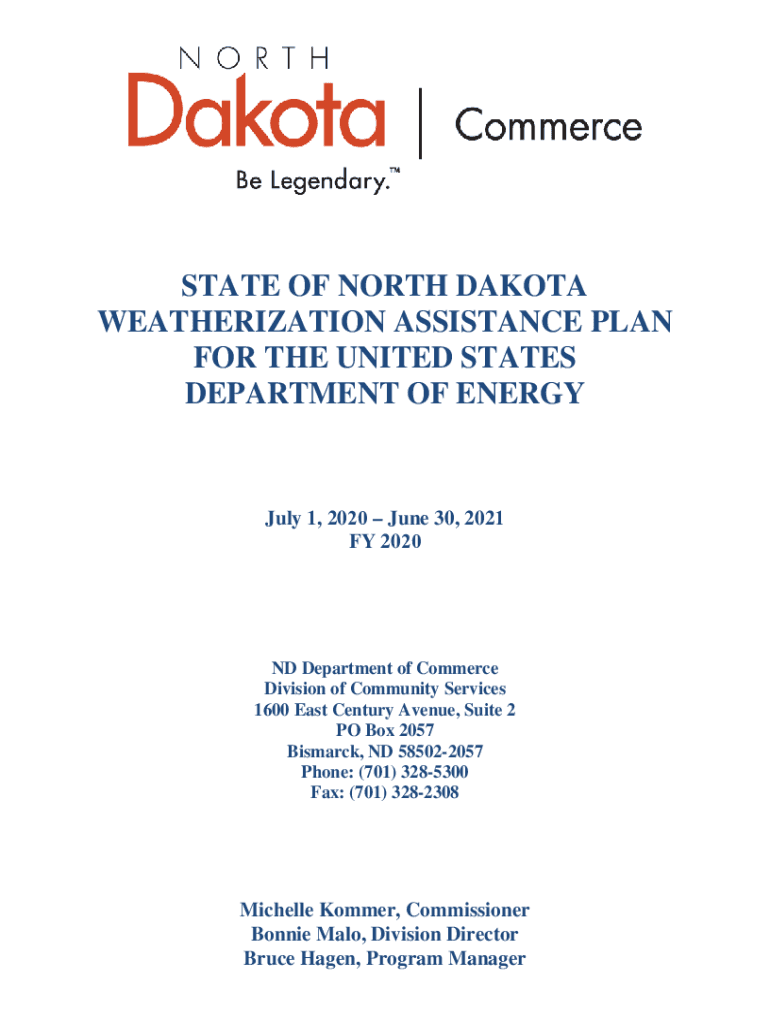 STATE OF NORTH DAKOTA WEATHERIZATION ASSISTANCE PLAN FOR THE UNITED STATES DEPARTMENT OF ENERGY July 1, 2020, June 30, 2021, FY 2020ND Department of Commerce Division of Community Services 1600 East