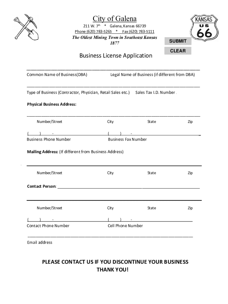 City of Galena 211 W. 7th * Galena, Kansas 66739 Phone (620) 7835265 * Fax (620) 7835111The The Oldest Mining Town in Southeast Kansas 1877Business License ApplicationSUBMIT CLEAR Common Name of Business(DBA)Legal