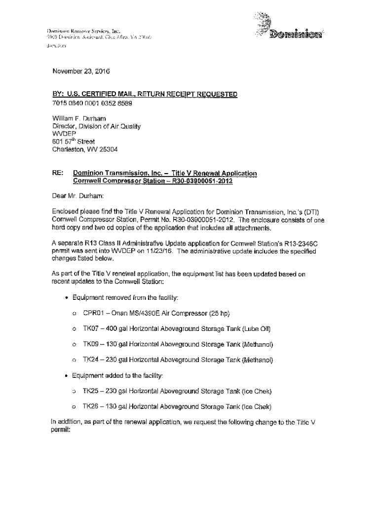CORNELL COMPRESSOR STATION DOMINION TRANSMISSION, INC. APPLICATION FOR TITLE V OPERATING PERMIT RENEWAL TITLE V OPERATING PERMIT NO: R30039000512012Dominion Transmission, Inc. Cornell Compressor Station