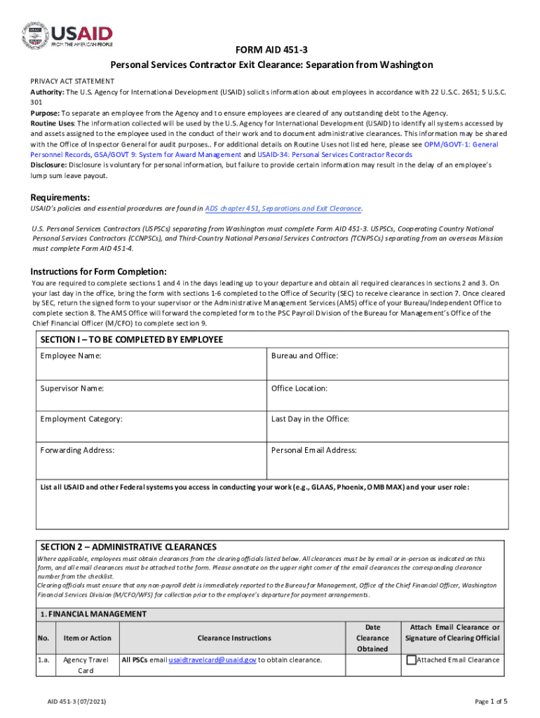 Get the free Form Aid 451-3 Personal Services Contractor Exit Clearance. Form Aid 451-3 Personal ...