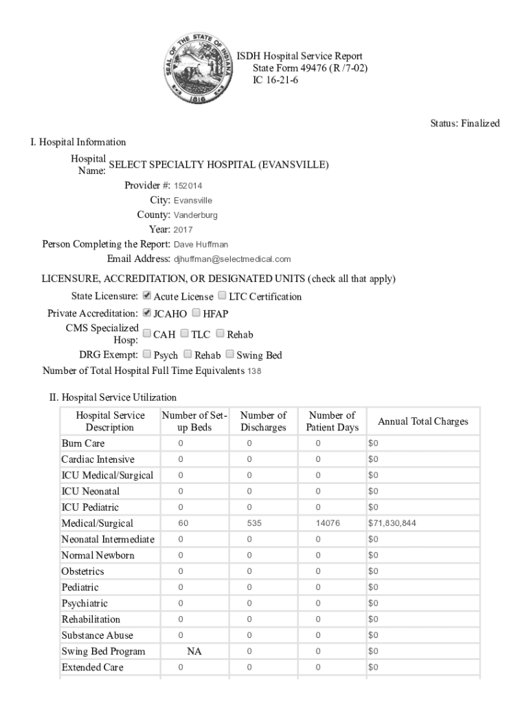 ISDN Hospital Service Report State Form 49476 (R /702) IC 16216Status: Finalized I. Hospital Information Hospital SELECT SPECIALTY HOSPITAL (EVANSVILLE) Name: Provider #: 152014 City: Evansville County: