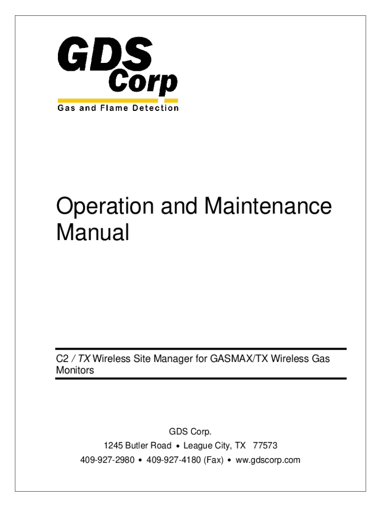 Operation and Maintenance ManualC2 / TX Wireless Site Manager for GASMAN/TX Wireless Gas Monitors GDS Corp. 1245 Butler Road 4099272980 League City, TX 775734099274180 (Fax)WW.score.comC2 / TX Operation