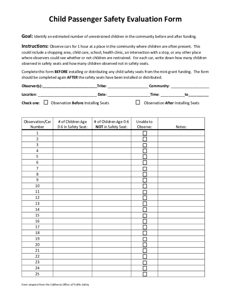 Child Passenger Safety Evaluation Form Goal: Identify an estimated number of unrestrained children in the community before and after funding. Instructions: Observe cars for 1 hour at a place in the