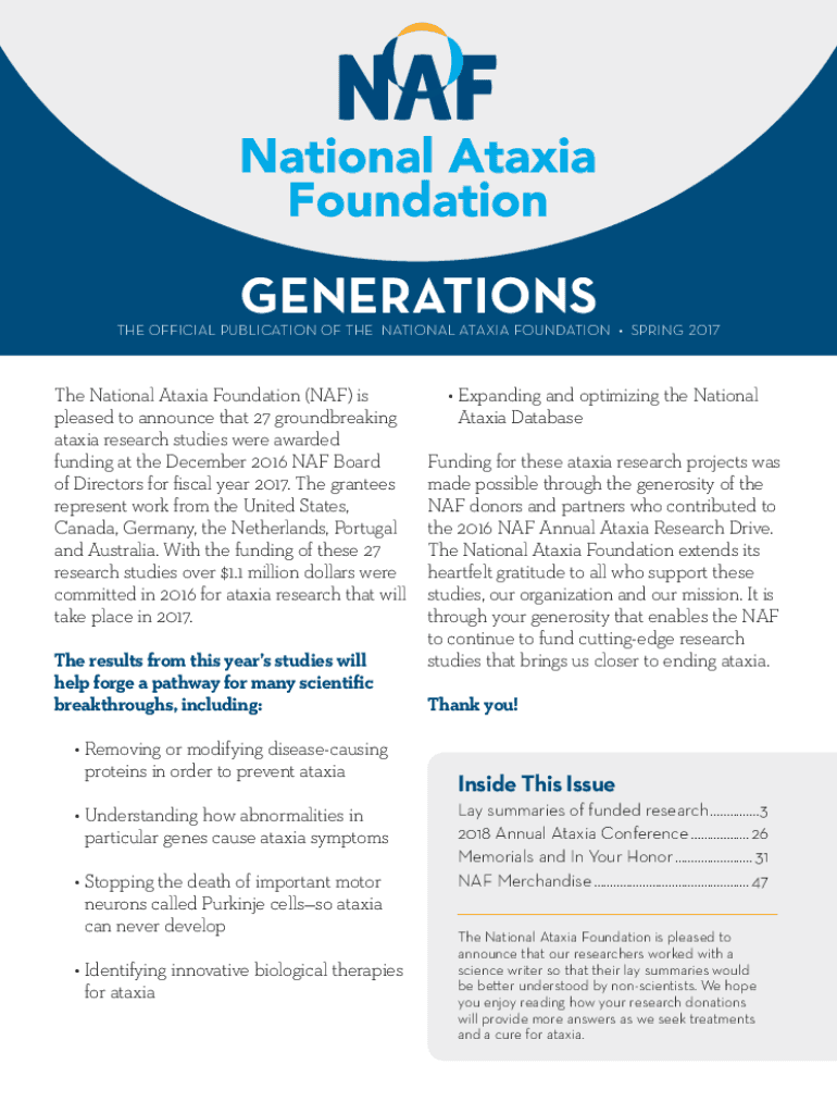 GENERATIONS OFFICIAL PUBLICATION OF THE NATIONAL ATAXIA FOUNDATION SPRING 2017The National Ataxia Foundation (NAF) is pleased to announce that 27 groundbreaking ataxia research studies were awarded