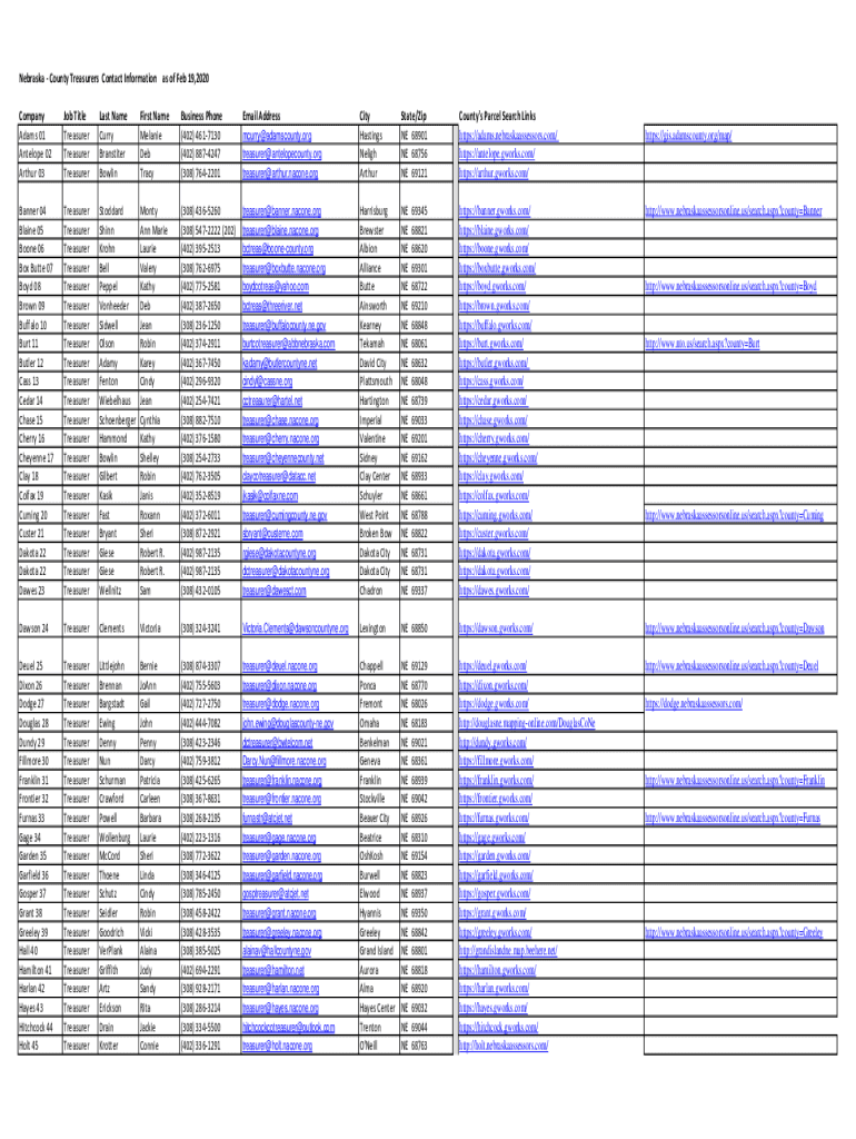Nebraska County Treasurers Contact Information as of Feb 19, 2020 Company Adams 01 Antelope 02 Arthur 03Job Title Treasurer Treasurers Name Curry Transmitter BowlinFirst Name Melanie Deb TracyBusiness