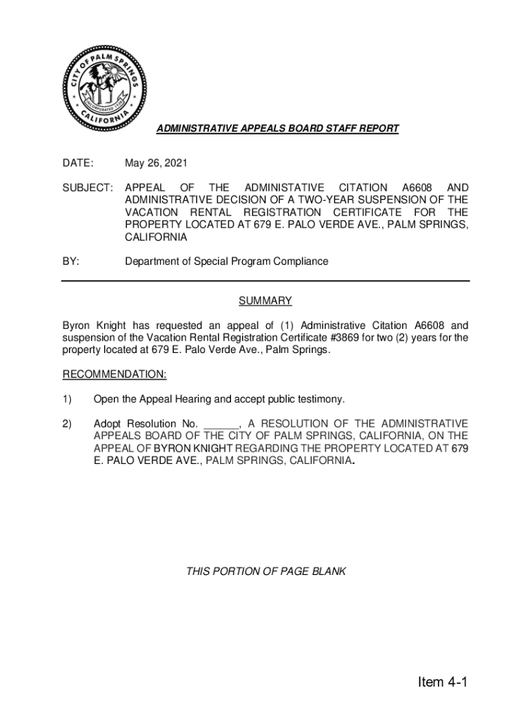 ADMINISTRATIVE APPEALS BOARD STAFF REPORTAGE:May 26, 2021SUBJECT:APPEAL OF THE ADMINISTRATIVE CITATION A6608 AND ADMINISTRATIVE DECISION OF A TWOFER SUSPENSION OF THE VACATION RENTAL REGISTRATION