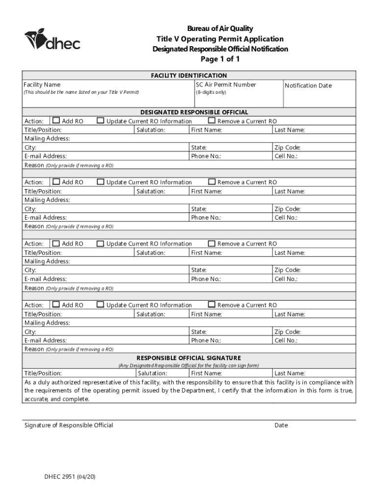 Bureau of Air Quality Title V Operating Permit Application Designated Responsible Official Notification Instructions Page 1 of 1 PLEASE DO NOT SEND A COPY OF THE INSTRUCTIONS IN WITH YOUR APPLICATION
