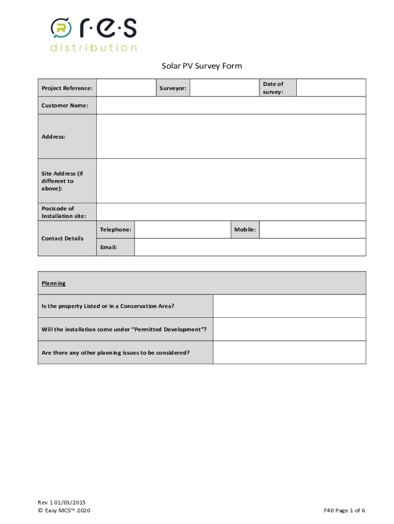 Solar PV Survey Form Project Reference:Date of survey:Surveyor:Customer Name:Address:Site Address (if different to above): Postcode of Installation site: Telephone:Mobile:Contact Details Email:Planning