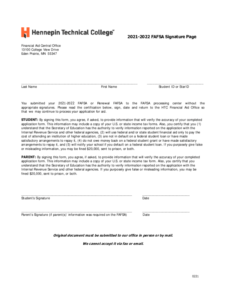 20212022 FAFSA Signature Page Financial Aid Central Office 13100 College View Drive Eden Prairie, MN 55347 Last Name First Name Student ID or Stardom submitted your 20212022 FAFSA or Renewal FAFSA