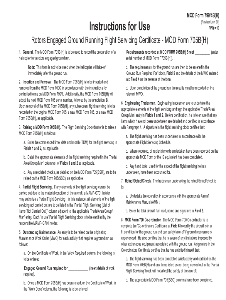 Instructions for Used Form 799/4B(H)(Revised Jun 20) PPQ 10Rotors Engaged Ground Running Flight Servicing Certificate MOD Form 705B(H) Requirements recorded at MOD FORM 705B(H) Sheet (enter serial
