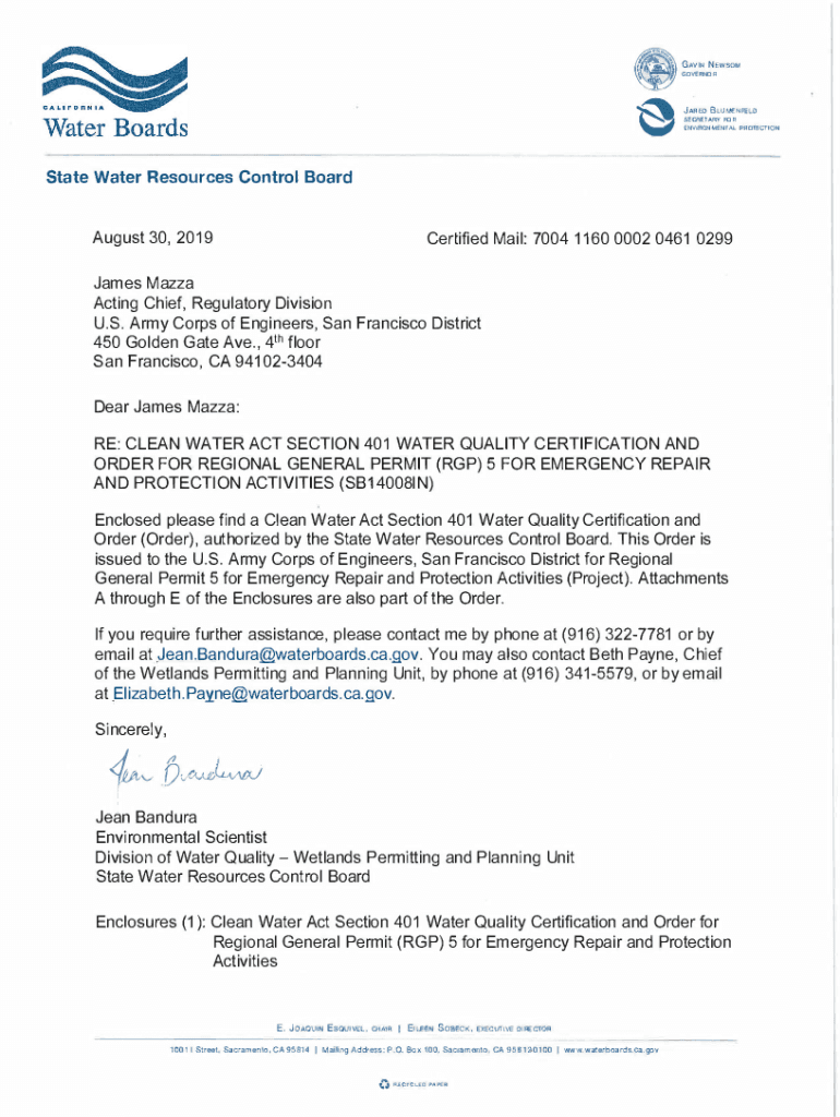 ,.l N GAVIN NEWSOM GOVERNORATE GRUENFELD SECRETARY FOR ENVIRONMENTAL PROTECTIONState Water Resources Control Board August 30, 2019Certified Mail: 7004 1160 0002 0461 0299James Mazda Acting Chief,