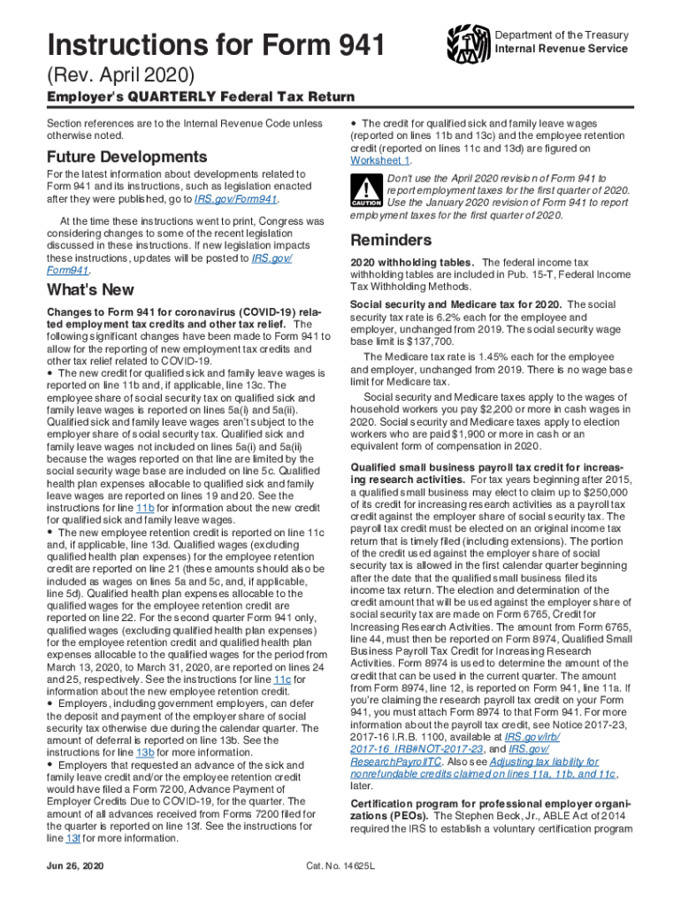 Instructions for Form 941Department of the Treasury Internal Revenue Service(Rev. April 2020)Employer\'s QUARTERLY Federal Tax Return Section references are to the Internal Revenue Code unless otherwise