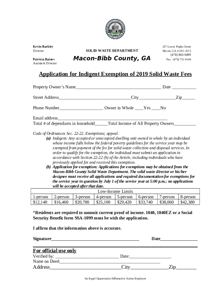 Application for Indigent Exemption of 2019 Solid Waste Fees template instructions