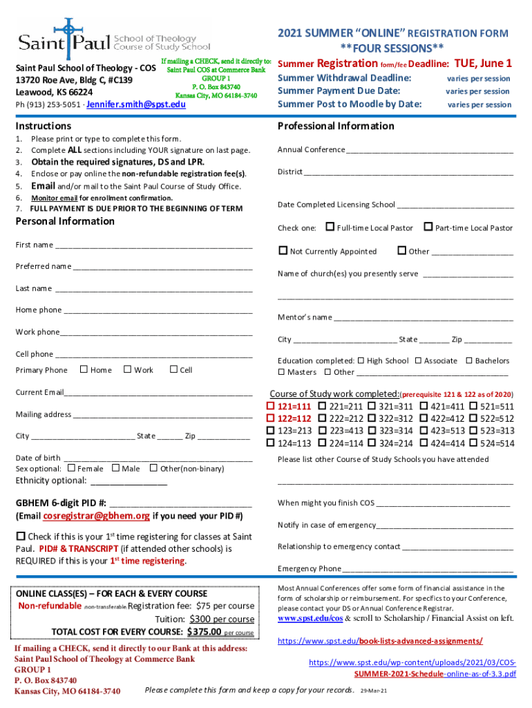 If mailing a CHECK, send it directly to:2021 SUMMER ONLINE REGISTRATION FORM **FOUR SESSIONS** Summer Registration form/fee Deadline: TUE, June 1Saint Paul School of Theology COS Saint Paul COS at
