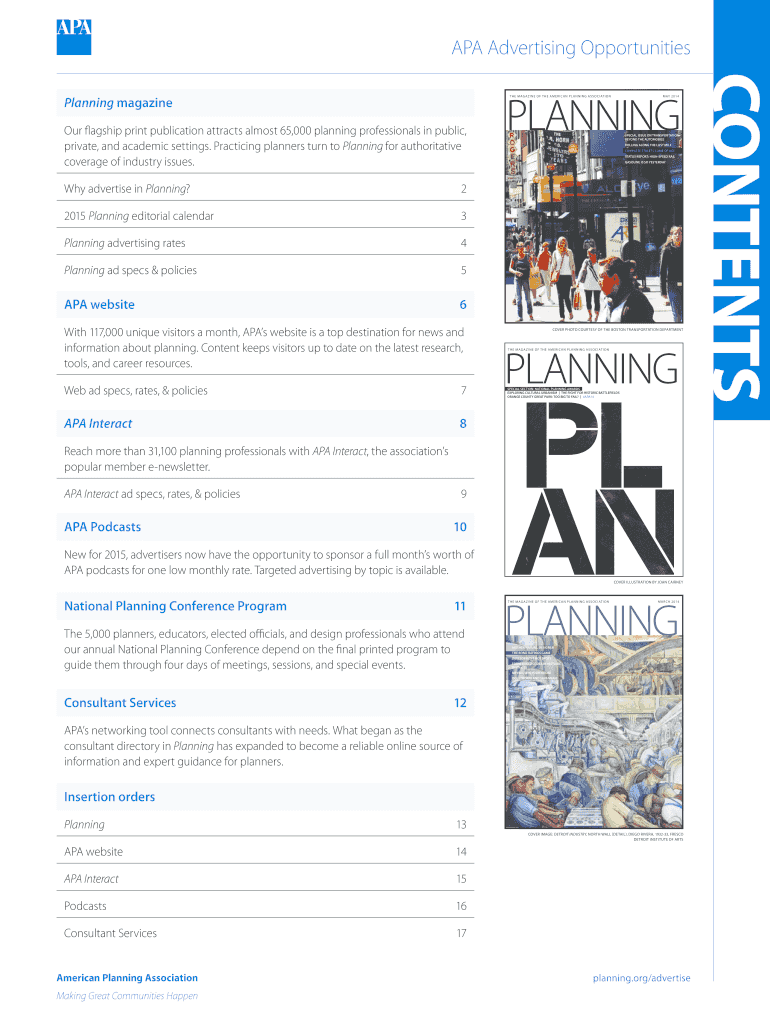 APA Advertising Opportunities Our flagship print publication attracts almost 65,000 planning professionals in public, private, and academic settings. Practicing planners turn to Planning for authoritative