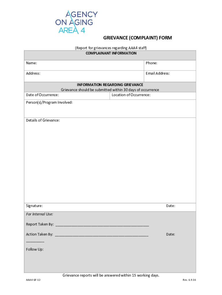 GRIEVANCE (COMPLAINT) FORM (Report for grievances regarding AAA4 staff) COMPLAINANT INFORMATION Name:Phone:Address:Email Address:INFORMATION REGARDING GRIEVANCE should be submitted within 30 days