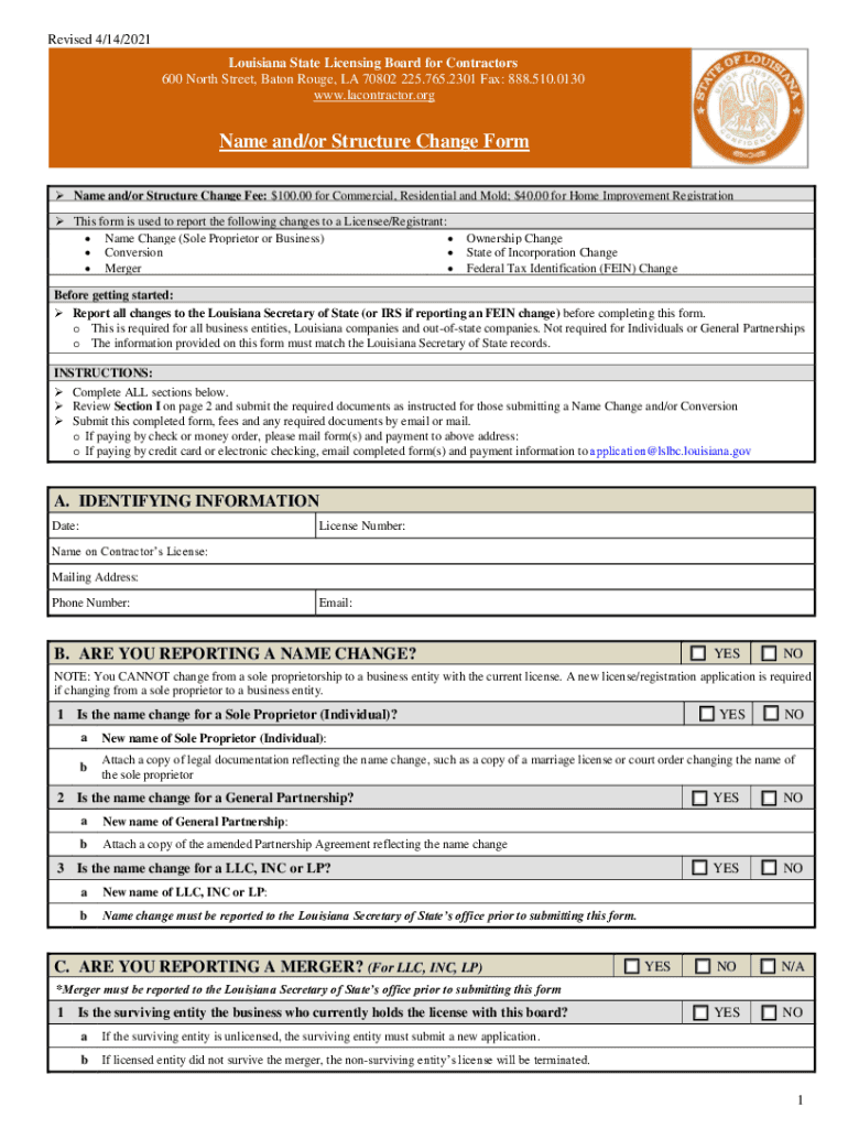 Revised 4/14/2021 Louisiana State Licensing Board for Contractors 600 North Street, Baton Rouge, LA 70802 225.765.2301 Fax: 888.510.0130 www.lacontractor.orgName and/or Structure Change Form Name
