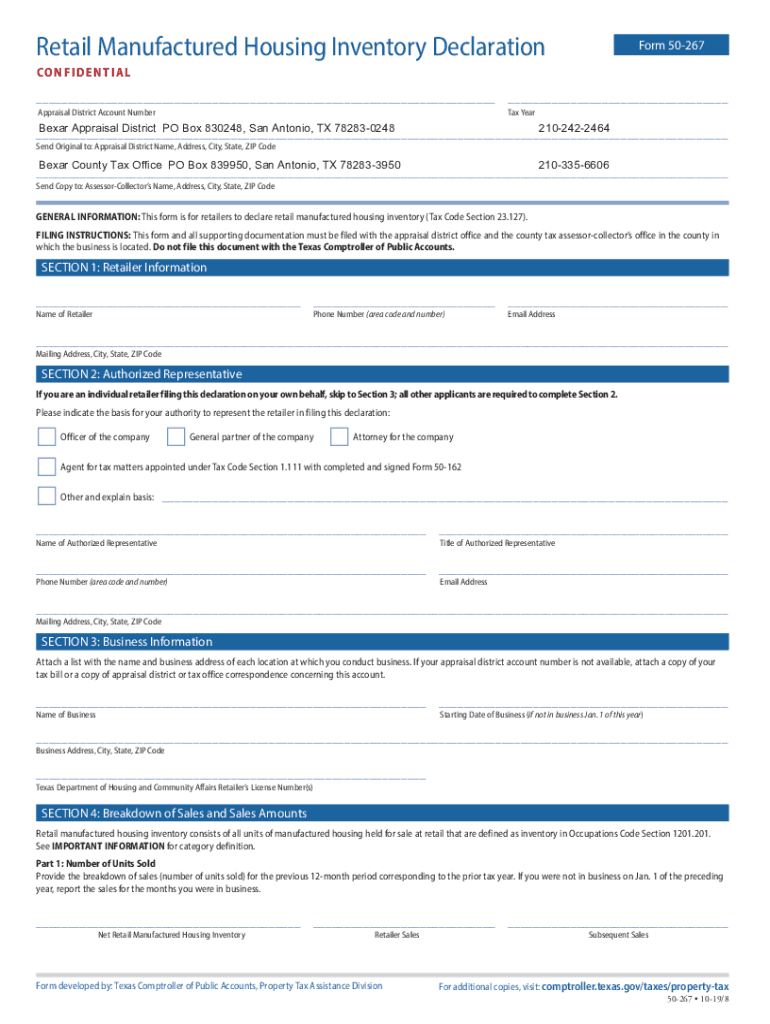 Retail Manufactured Housing Inventory DeclarationForm 50267CONFIDENTIAL Appraisal District Account Number Forebear Appraisal District PO Box 830248, San Antonio, TX 782830248 2102422464 Send Original