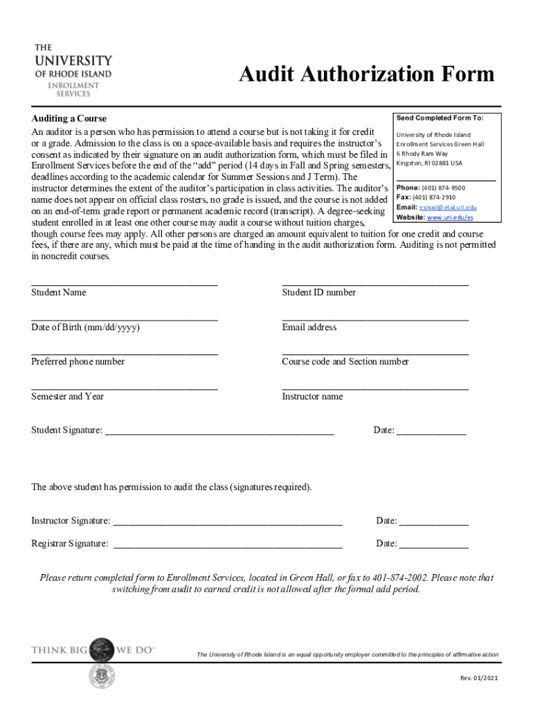 Audit Authorization Form Send Completed Form To: Auditing a Course An auditor is a person who has permission to attend a course but is not taking it for credit University of Rhode Island or a grade.