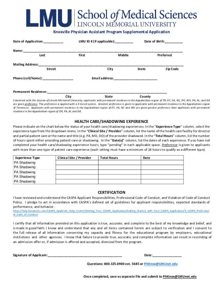 Knoxville Physician Assistant Program Supplemental Application Date of Application: LMU ID # (if applicable): Date of Birth: Name: Last First Middle Preferred Mailing Address: Street City State Zip