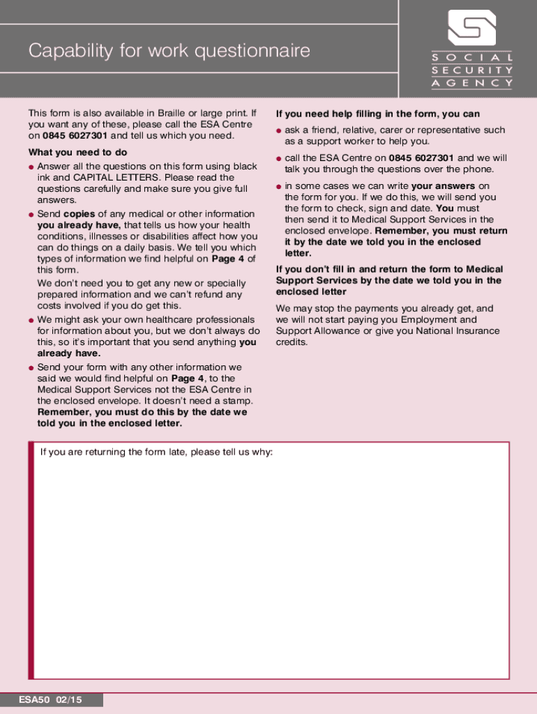 Capability for work questionnaire This form is also available in Braille or large print. If you want any of these, please call the ESA Center on 0845 6027301 and tell us which you need. What you need