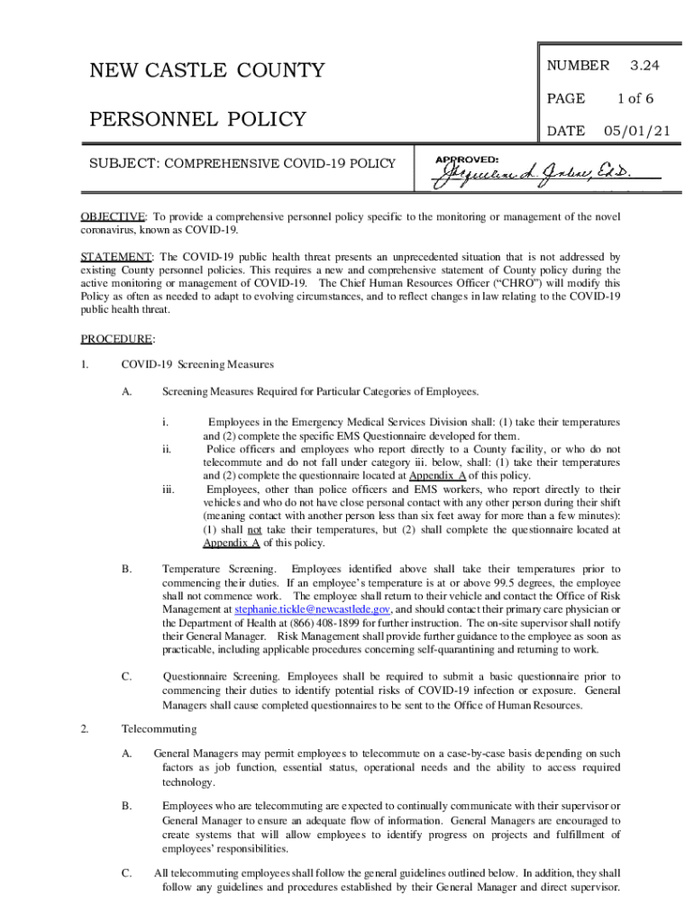 NEW CASTLE COUNTY PERSONNEL POLICYNUMBER3.24PAGE1 of 6DATE05/01/21SUBJECT: COMPREHENSIVE COVID-19 POLICYOBJECTIVE: To provide a comprehensive personnel policy specific to the monitoring or management