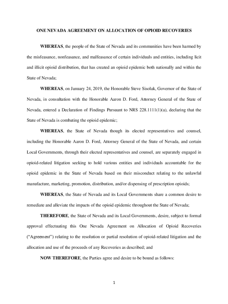 ONE NEVADA AGREEMENT ON ALLOCATION OF OPIOID RECOVERIESWHEREAS, the people of the State of Nevada and its communities have been harmed by the misfeasance, malfeasance, and malfeasance of certain individuals