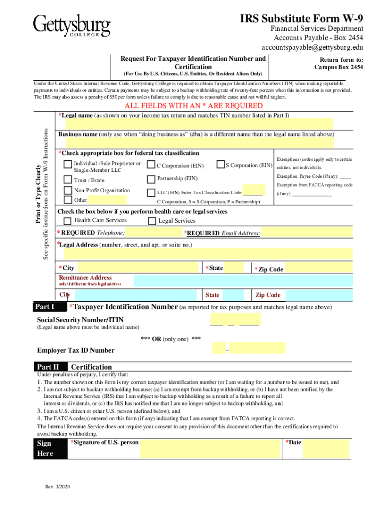 IRS Substitute Form W9Financial Services Department Accounts Payable Box 2454 accountspayable@gettysburg.edu Return form to: Campus Box 2454Request For Taxpayer Identification Number and Certification
