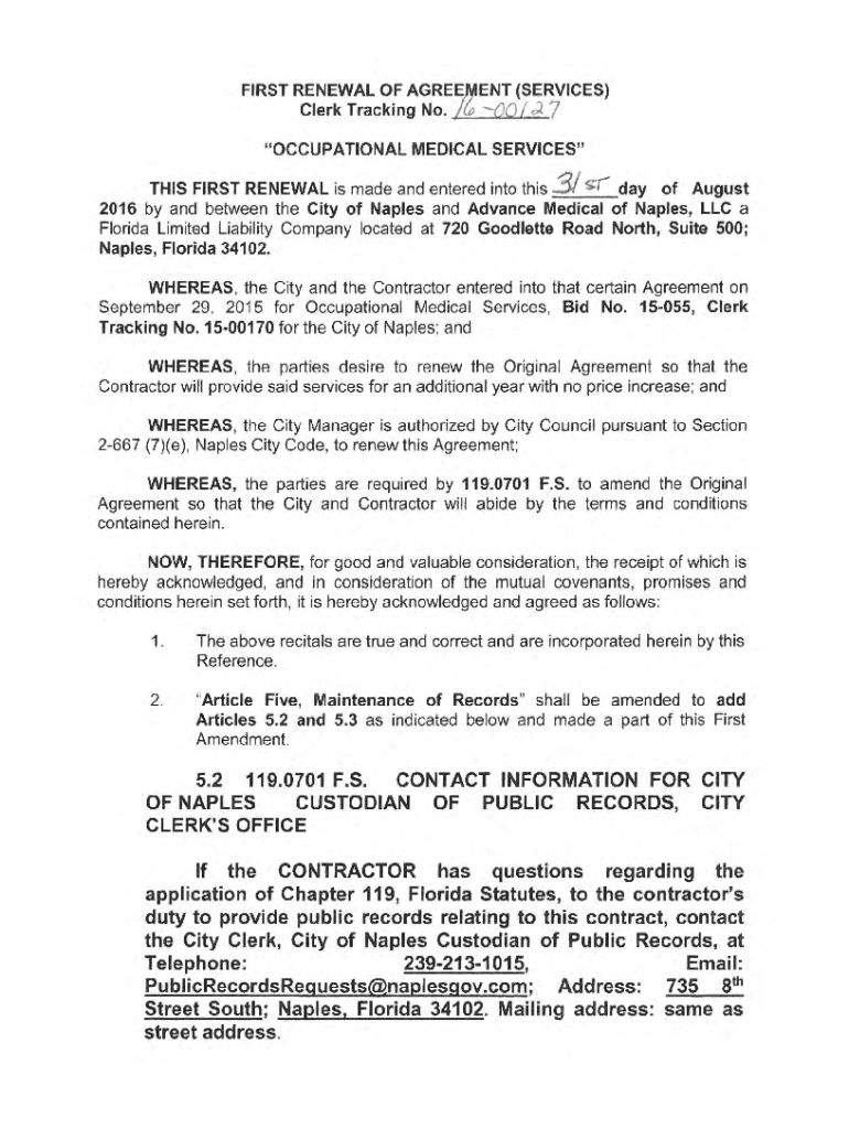 FIRST RENEWAL OF AGREEMENT (SERVICES) Clerk Tracking No. / OC/ 7 “OCCUPATIONAL MEDICAL SERVICES “3/day of August THIS FIRST RENEWAL is made and entered into this 2016 by and between the City of