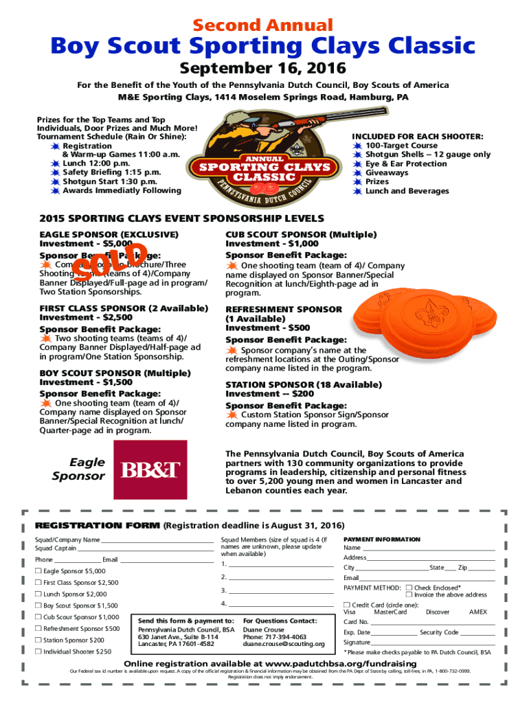 Second Annually Scout Sporting Clays Classic September 16, 2016For the Benefit of the Youth of the Pennsylvania Dutch Council, Boy Scouts of America M&E Sporting Clays, 1414 Moseley Springs Road,
