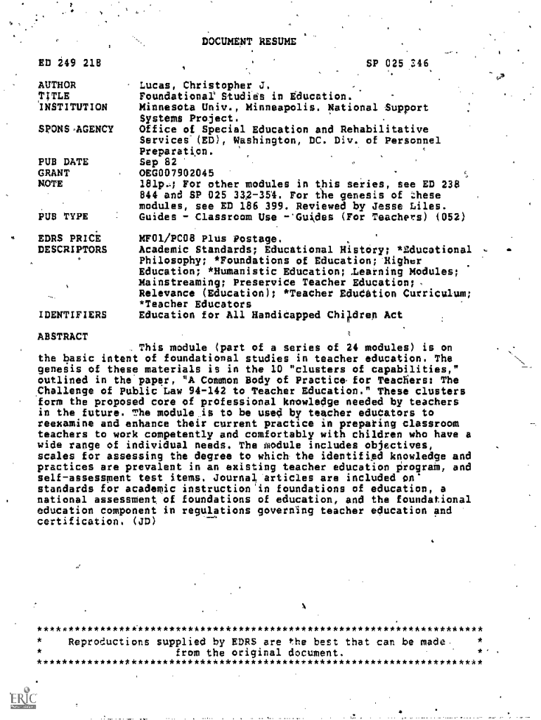 DOCUMENT RESUME ED 249 218AUTHOR TITLE 'INSTITUTIONSPONS0AGENCY PUB DATE GRANT MOTE PUB TYPERS PRICE DESCRIPTORSIDENTIFIERSSP 025 346, Lucas, Christopher J. Foundational Studies in Education. Minnesota