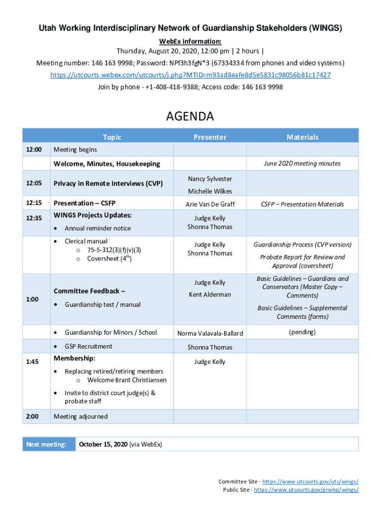 Utah Working Interdisciplinary Network of Guardianship Stakeholders (WINGS) WebEx information: Thursday, August 20, 2020, 12:00 pm 2 hours Meeting number: 146 163 9998; Password: NPf3h3fgN×3 (67334334