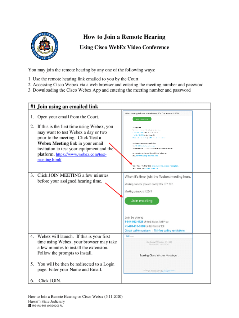 How to Join a Remote Hearing Using Cisco Webex Video Conference may join the remote hearing by any one of the following ways: 1. Use the remote hearing link emailed to you by the Court 2. Accessing
