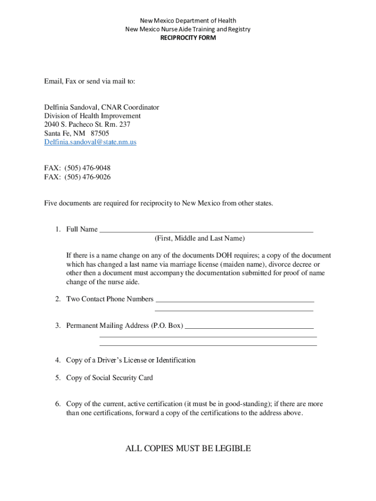 New Mexico Department of Health New Mexico Nurse Aide Training and Registry RECIPROCITY Foresail, Fax or send via mail to:Delphinium Sandoval, CAR Coordinator Division of Health Improvement 2040 S.
