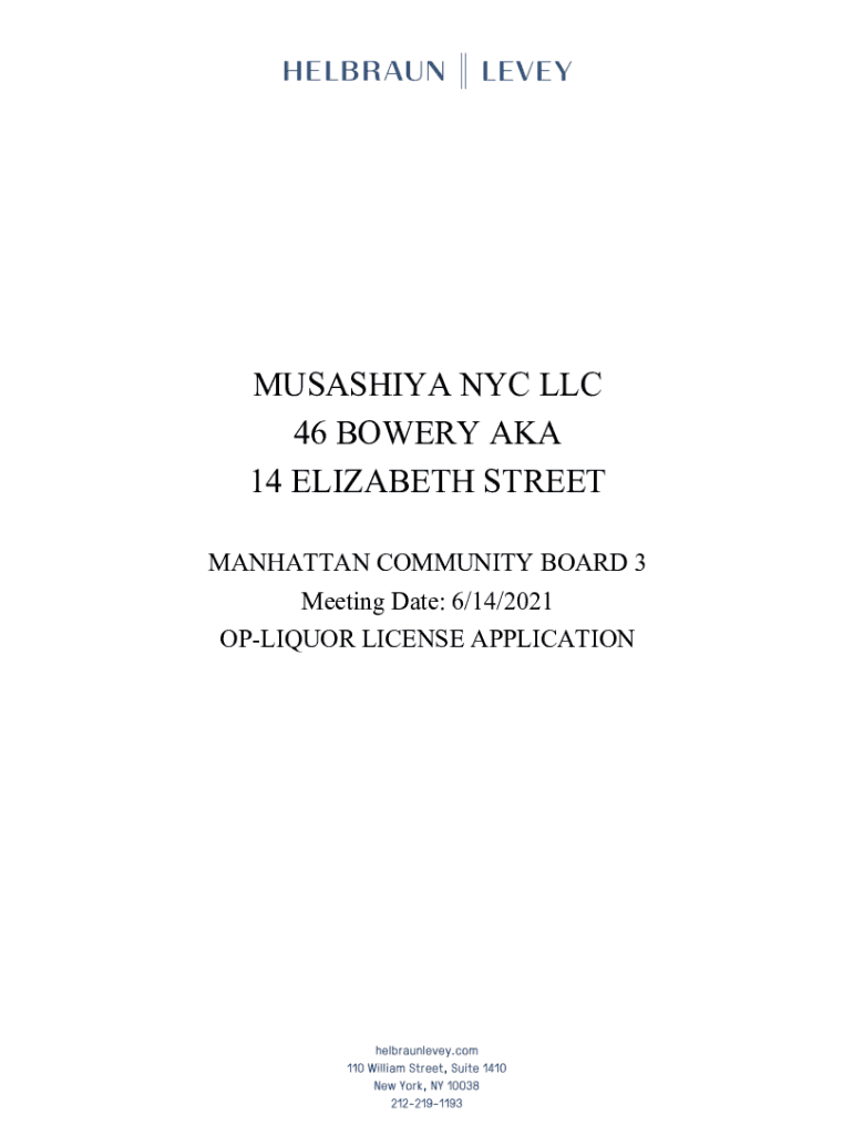 MUAWIYA NYC LLC 46 BOWERY AKA 14 ELIZABETH STREET MANHATTAN COMMUNITY BOARD 3 Meeting Date: 6/14/2021 LIQUOR LICENSE APPLICATION CITY OF NEW YORK MANHATTAN COMMUNITY BOARD 3 59 East 4th Street New