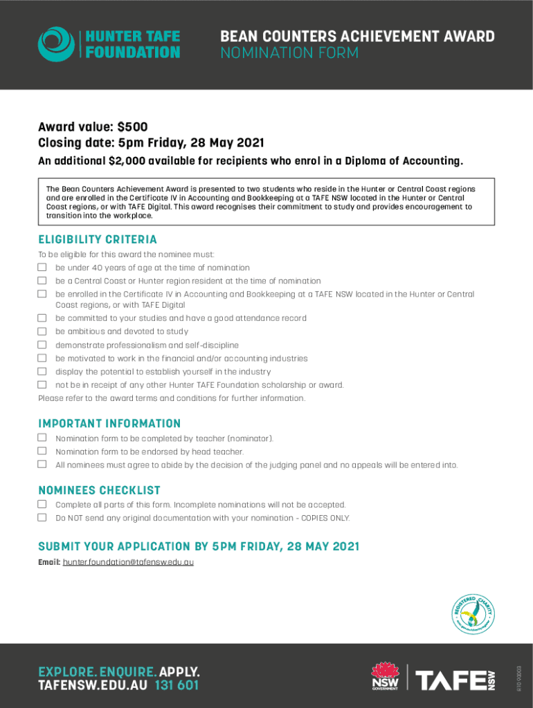 Get the free Hunter TAFE Foundation Bean Counters Achievement Award nomination form