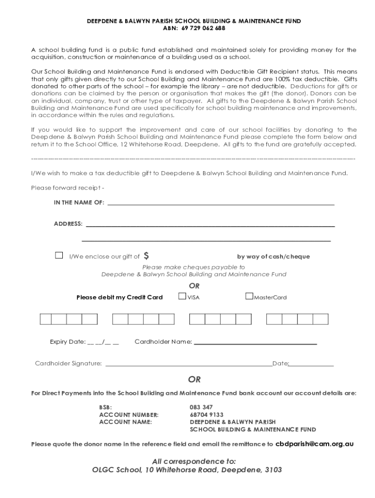 DEEPENED & BALDWIN PARISH SCHOOL BUILDING & MAINTENANCE FUND ABN: 69 729 062 688 A school building fund is a public fund established and maintained solely for providing money for the acquisition,