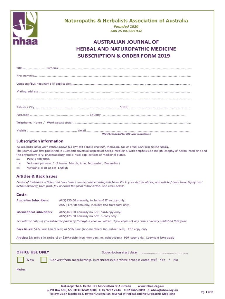 Naturopaths & Herbalists Association of Australia Founded 1920ABN 25 000 009 932AUSTRALIAN JOURNAL OF HERBAL AND NATUROPATHIC MEDICINE SUBSCRIPTION & ORDER FORM 2019 Title ..........................
