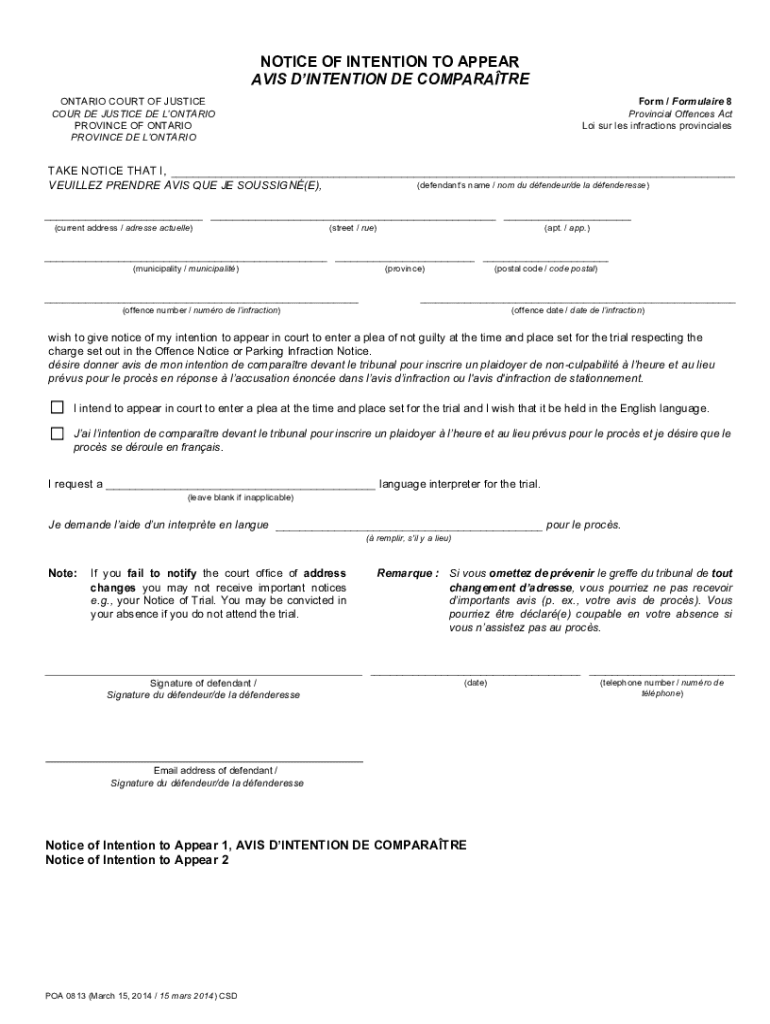 NOTICE OF INTENTION TO APPEAR AVIS INTENTION DE COMPARABLE Form / Formula ire 8 Provincial Offenses Act LOI SUR LES infractions provincialesONTARIO COURT OF JUSTICE FOUR DE JUSTICE DE ONTARIO PROVINCE