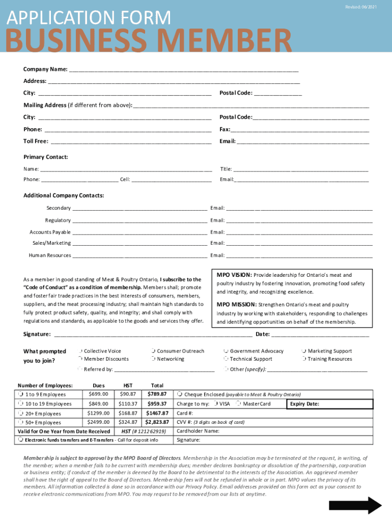 APPLICATION FORMRevised: 06/2021BUSINESS MEMBERCompany Name: Address: City: Postal Code: Mailing Address (if different from above): City: Postal Code: Phone: Fax: Toll Free: Email: Primary Contact: