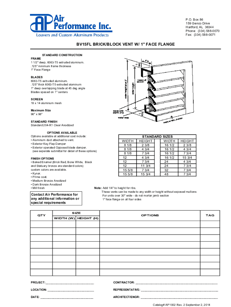 P.O. Box 86 159 Gen co Drive Hartford, AL 36344 Phone: (334) 5880070 Fax: (334) 5880071BV15FL BRICK/BLOCK VENT W/ 1 FACE FLANGE STANDARD CONSTRUCTION FRAME 1 1/2 deep, 6063T5 extruded aluminum. .125