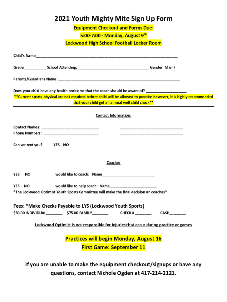 2021 Youth Mighty Mite Sign Up Form Equipment Checkout and Forms Due: 5:007:00 Monday, August 9th Lockwood High School Football Locker Room Child's Name Grade School Attending: Gender: M or F Parents/Guardians